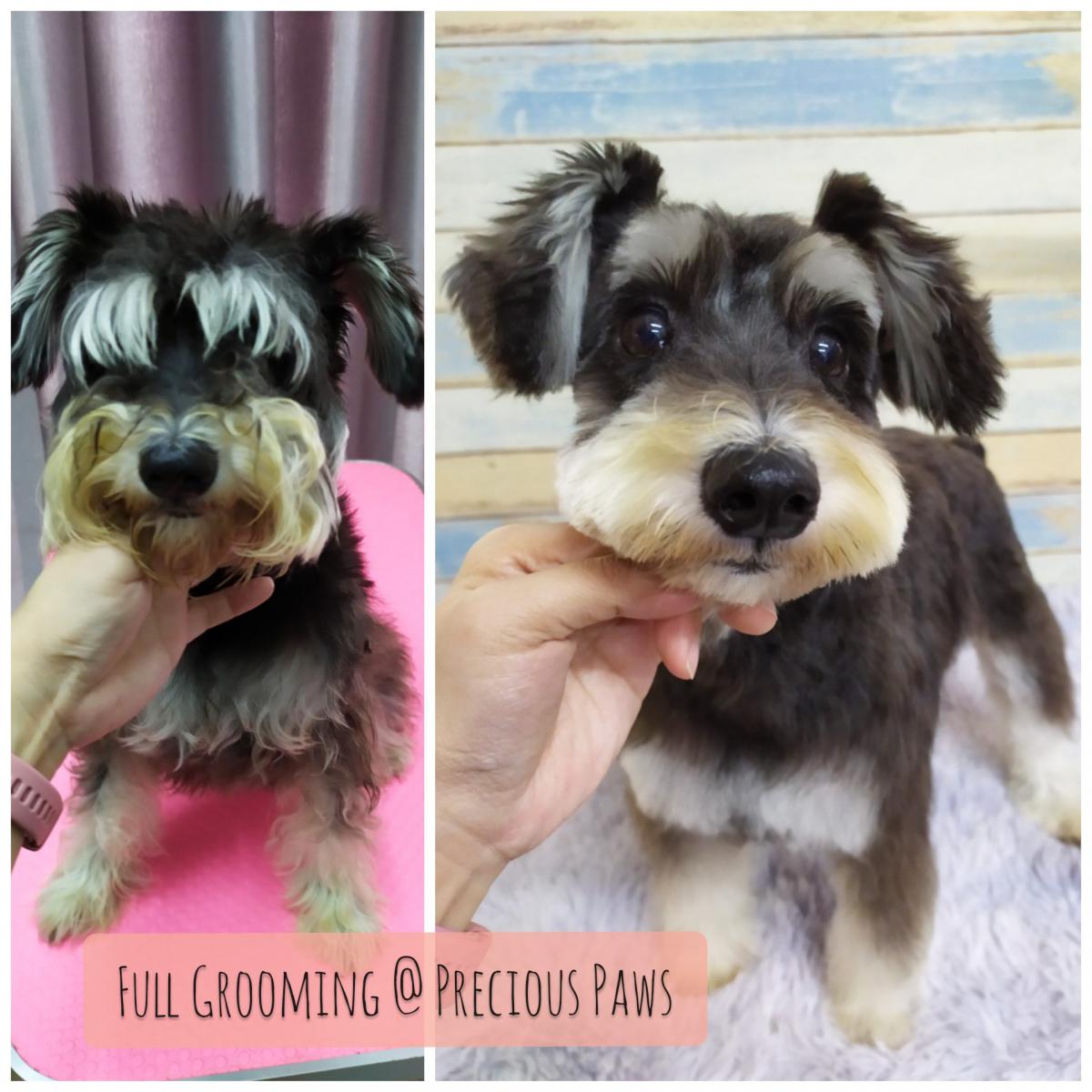 Full grooming includes shower, blow-drying, brushing, nail clipping, ear cleaning, paw trimming, minor fur detangling & anal shaving + clipping + scissoring of coat.